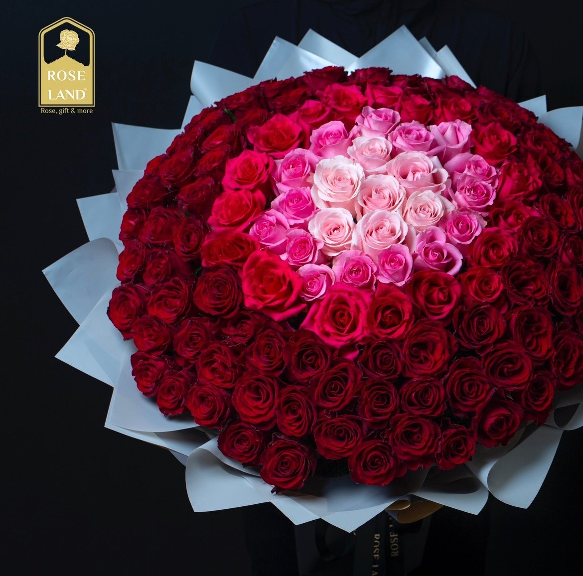 باقة "لحن الزهور" تعكس تناغمًا ساحرًا من الألوان وتفاصيل فنية متقنة. تتكون هذه الباقة الفخمة من 150 وردة روز أكوادورية، مرتبة بدقة لتشكل تدرجًا لونيًا مبهرًا ينتقل من درجات الأحمر الداكن إلى الوردي الفاتح وصولاً إلى الأبيض، ما يعبر عن حب عميق ومشاعر دافئة.
