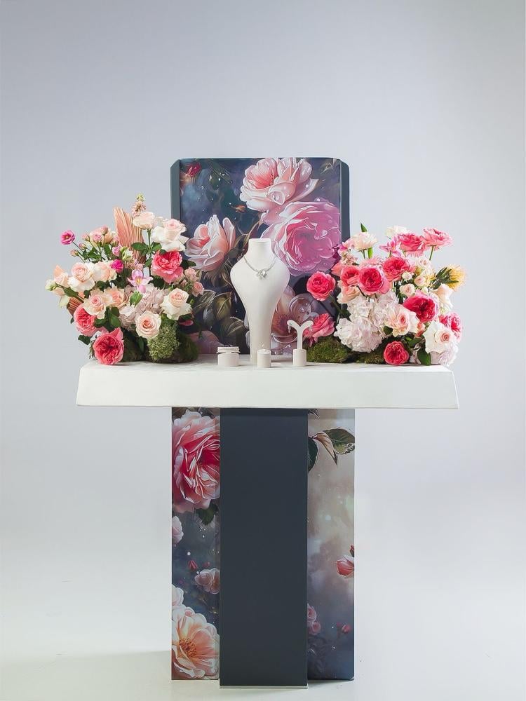 زهور صغيرة تم اختيارها بعناية لتكمل التنسيق وتُضفي لمسة من الدفء والأنوثة الراقية.